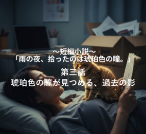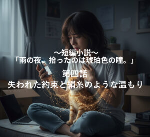 私はシズクを抱き上げる。 シズクは「ニャ(秘密)」とでも言うように、私の鼻先に自分の鼻を押し付けた。 その琥珀色の瞳は、相変わらず深く、そして以前よりも増して、神秘的な光を湛えていた。